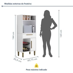 Perfeita! Compacta e funcional, ela otimiza o espaço e ajuda a manter sua cozinha sempre organizada. Acabamento: Pintura UV Acabamento da Gaveta: Pintura UV Acabamento da Porta: Pintura UV Acabamento da Prateleira: Pintura UV Acabamento dos Pés: Pintura Altura dos Pés: 17 cm Ambiente Principal: Cozinha Cesto para Frutas: 02 Cesto Removível: Sim codigo_ean: 7900288072177 Complexidade da Montagem: Baixa: pode ser montado por uma pessoa sozinha Cor: Branco Cor do Produto: Branco Cor Interna: Branco Escala de Brilho: Semi-Brilho Escala de Brilho da Gaveta: Semi-Brilho Escala de Brilho da Porta: Semi-Brilho Escala de Brilho da Prateleira: Semi-Brilho Gaveta com Chave: Não Itens Inclusos: 1 Fruteira + 1 Kit de Ferragens + 1 Manual de Montagem. Manual de Montagem e Instalação: https://cdn2.madeiramadeira.com.br/prd/kaiki-moveis/2691215-1739555076-978308-149274.pdf Marca: Kaiki Móveis Material da Corrediça: Aço Material da Dobradiça/Corrediça da Porta: Aço Material da Gaveta: MDP Material da Porta: MDP Material da Prateleira: MDP Material do Cesto: Plástico Material do Puxador da Gaveta: MDF Material do Puxador da Porta: MDF Material dos Pés: Plástico Necessita Montagem: Sim Origem do Produto: Nacional Pés Reguláveis: Sim Peso: 27,25 kg Peso Máximo por Gaveta: 5 kg Peso Máximo por Prateleira: 10 kg Possui Pés: 04 Possui Portas: 01 Recomendações de Uso, Manutenção e Limpeza: Limpar com flanela limpa e seca. Não usar produtos abrasivos. Sapatas Niveladoras: Sim Sistema de Montagem: Parafusos, Minifix, Cavilha, Pregos Suporta Até (kg): 40 kg Tipo de Corrediça da Gaveta: Telescópica Tipo de Dobradiça/Corrediça da Porta: Simples Tipo de Porta: Bater Tipo de Puxador da Gaveta: Externo Tipo de Puxador da Porta: Externo
