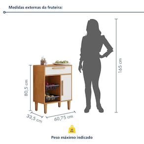 Perfeita! Compacta e funcional, ela otimiza o espaço e ajuda a manter sua cozinha sempre organizada. Acabamento: Pintura UV Acabamento da Gaveta: Pintura UV Acabamento da Porta: Pintura UV Acabamento dos Pés: Pintura Altura dos Pés: 17 cm Ambiente Principal: Cozinha Cesto para Frutas: 02 Cesto Removível: Sim codigo_ean: 7900288070746 Complexidade da Montagem: Baixa: pode ser montado por uma pessoa sozinha Cor: Marrom/Off White Cor do Produto: Marrom/Off White Cor Interna: Marrom Escala de Brilho: Semi-Fosco Escala de Brilho da Gaveta: Semi-Brilho Escala de Brilho da Porta: Semi-Brilho Gaveta com Chave: Não Itens Inclusos: 1 Fruteira + Kit de Ferragens + Manual de Montagem. Manual de Montagem e Instalação: https://cdn2.madeiramadeira.com.br/prd/kaiki-moveis/2691217-1739555077-978307-149272.pdf Marca: Kaiki Móveis Material da Corrediça: Aço Material da Dobradiça/Corrediça da Porta: Aço Material da Gaveta: MDP Material da Porta: MDP Material do Cesto: Plástico Material do Puxador da Gaveta: MDF Material do Puxador da Porta: MDF Material dos Pés: Plástico Necessita Montagem: Sim Origem do Produto: Nacional Pés Reguláveis: Sim Peso: 16,25 kg Peso Máximo por Gaveta: 5 kg Possui Pés: 04 Possui Portas: 01 Recomendações de Uso, Manutenção e Limpeza: Limpar com flanela limpa e seca. Não usar produtos abrasivos. Sapatas Niveladoras: Sim Sistema de Montagem: Parafusos, Minifix, Cavilha, Pregos Suporta Até (kg): 25 kg Tipo de Corrediça da Gaveta: Telescópica Tipo de Dobradiça/Corrediça da Porta: Simples Tipo de Porta: Bater Tipo de Puxador da Gaveta: Externo Tipo de Puxador da Porta: Externo