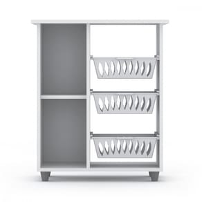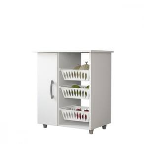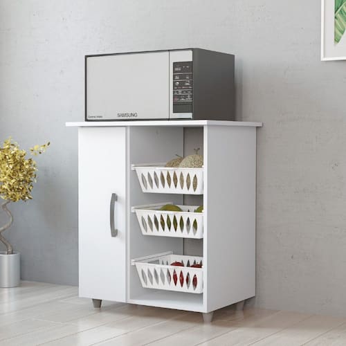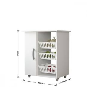 Características: A Fruteira é produzido em MDP Acabamento em pintura UV Possui puxadores plásticos na tonalidade Onix e pés 3 Cestos 1 Porta