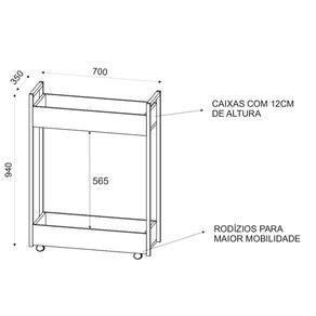 Características: Estrutura em aço carbono com pintura TX texturizada; Acabamento em melamina BP; Cestos em MDP 15mm; Possui 2 cestos espaçosos; Possui 4 rodízios que permitem fácil movimentação;