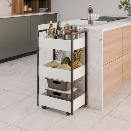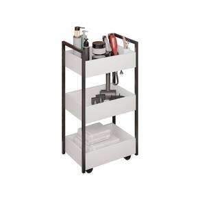 Características: Estrutura em aço carbono com pintura TX texturizada; Acabamento em melamina BP; Cestos em MDP 15mm; Possui 3 cestos espaçosos; Possui 4 rodízios que permitem fácil movimentação;