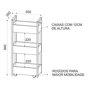 Características: Estrutura em aço carbono com pintura TX texturizada; Acabamento em melamina BP; Cestos em MDP 15mm; Possui 3 cestos espaçosos; Possui 4 rodízios que permitem fácil movimentação;