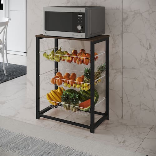 Fruteira Com Suporte Para Micro-Ondas Barcelona Aço Preto Cesto Branco Tampo Amêndoa A Fruteira Suporte de Micro-ondas Barcelona possui 3 cestos estilo gaveta, para o armazenamento de frutas e legumes e ainda possui tampo de MDF na parte superior, livre para colocar objetos de decoração, utensílios e ela é ideal para colocar seu micro-ondas. A Fruteira fica linda em qualquer tipo de cozinha. Facilitando na organização e na praticidade do dia a dia.