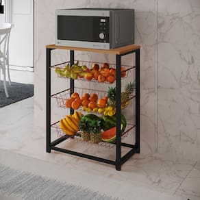 Fruteira Com Suporte Para Micro-Ondas Barcelona Aço Preto Cesto Cobre Tampo Canela A Fruteira Suporte de Micro-ondas Barcelona possui 3 cestos estilo gaveta, para o armazenamento de frutas e legumes e ainda possui tampo de MDF na parte superior, livre para colocar objetos de decoração, utensílios e ela é ideal para colocar seu micro-ondas. A Fruteira fica linda em qualquer tipo de cozinha. Facilitando na organização e na praticidade do dia a dia.