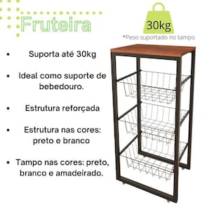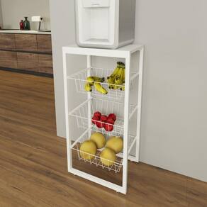 Fruteira De Chão Branco Brilho Em Aço Branco Fruteira multiuso com cestos deslizantes produzida em aço, podendo ser utilizada em vários ambientes na cozinha, banheiro, quarto, facilitando seu dia-a-dia. Seu tampo superfície superior em MDF permite sua utilização para diversas outras possibilidades, como a utilização de arranjos ou até mesmo utensílios domésticos, como BEBEDOURO, suportando até 30 kg, o que lhe propicia um excelente custo-benefício. Dimensões: Altura - 80cm Largura - 39,5cm Profundidade - 23cm Beneficios: Cestos Deslizante, de fácil encaixe. Produto resistente. Com sistema de regulagem de altura. Pintura eletróstatica Epóxi, maior durabilidade não enferruja Conteúdo da Embalagem: 1- Fruteira 3 cesto de fábrica. 3 meses contra defeito de fabricacão. Marca: Não Informado Ean: 7890213720191