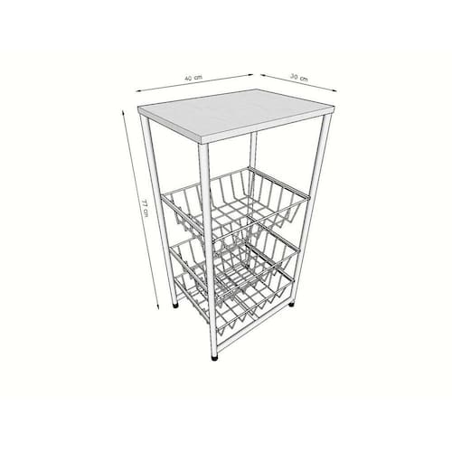 Fruteira de chão cozinha aço mdf 3 cestos multiuso Cor: branco Produto vai desmontado, necessita realizar a montagem O produto já é enviado com o kit para instalação. Fruteira multiuso com cestos deslizantes produzida em aço, podendo ser utilizada em vários ambientes na cozinha, banheiro, quarto, facilitando seu dia-a-dia. Seu tampo superfície superior em mdf permite sua utilização para diversas outras possibilidades, como a utilização de arranjos ou até mesmo utensílios domésticos, como bebedouro, suportando até 30 kg, o que lhe propicia um excelente custo-benefício. Dimensões: Altura - 77cm Largura - 40cm Profundidade - 30cm Benefícios: Cestos deslizante, de fácil encaixe. Produto resistente. Pintura eletrostática epóxi, maior durabilidade não enferruja Conteúdo da embalagem: 1- fruteira preta com mdf de 3 cesto de fábrica. 3 meses contra defeito de fabricação. Marca: Não Informado