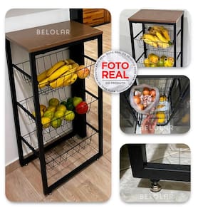 1- fruteira preta com mdf amadeirado de 3 cesto
