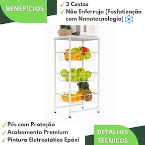 Fruteiras de chão unem praticidade e design em uma casa bem decorada, são ideais para compor ambientes como cozinha, áreas de lazer ou varanda. Produzida em aço com acabamento anti-ferrugem e pintura eletrostática epóxi, que garante muito mais durabilidade, seus pés possuem bordas emborrachadas evitando que deslize ou risque o piso de sua casa. ESPECIFICAÇÕES TÉCNICAS Ambientes indicados: Cozinhas, Áreas de lazer e Varanda. Formato: Retangular Acabamento: Pintura Eletrostática Epóxi Cor: Branco Material Estrutura: Tubo de Aço com proteção anti-ferrugem Requer Montagem: Não Peso Suportado: 30Kg Conteúdo da Embalagem: 1 Fruteira e 3 Cestos Quantidade de Cestos: 3 Cestos Removíveis: Sim Recomendações de Uso, Manutenção e Limpeza: Utilizar um pano seco ou levemente umedecido DIMENSÕES GERAIS Altura: 81cm Largura: 40cm Profundidade: 30cm