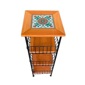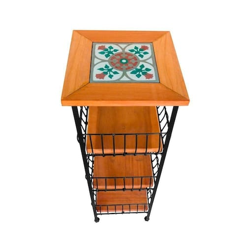 Fruteira de chão com três andares, construída por artesãos premiados, usando madeira maciça, ferro com pintura eletrostática antiferrugem e um ladrilho Hidráulico. Seu ótimo trabalho e materiais que garantem um excelente acabamento e a certeza de que irá durar muitos anos sem perder sua beleza .