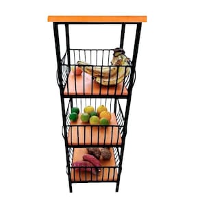 Fruteira de chão com três andares, construída por artesãos premiados, usando madeira maciça, ferro com pintura eletrostática antiferrugem e um ladrilho Hidráulico. Seu ótimo trabalho e materiais que garantem um excelente acabamento e a certeza de que irá durar muitos anos sem perder sua beleza .