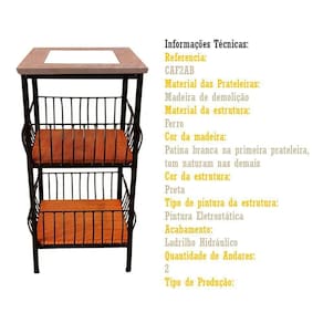 Fruteira de chão com dois andares, construída por artesãos premiados, usando madeira de demolição tratada e ferro com pintura eletrostática antiferrugem.
