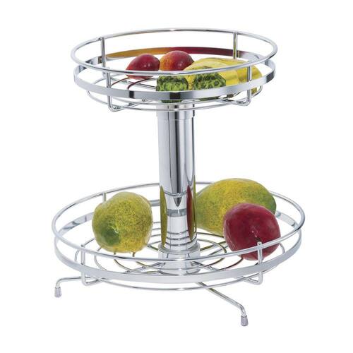 Fruteira de Mesa Dupla Giratória Redonda Cromada 350mm - 2414Estrutura do cesto com arame 6mm e arame chato de 2,8x11,5mm Fundo com arame de 4mm Tubo de 2 polegadasPonteiras de silicone no pé 01 Cesto ø 350 01 Cesto ø 300 Altura de 300mm Cromado Sem Vidro