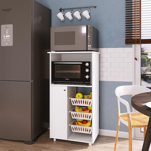 Funcionalidade e estilo para sua cozinha A Fruteira Genialflex Dubai é a escolha perfeita para quem busca praticidade aliada a um design moderno e eficiente. Com 60,5 cm de largura, ela oferece um nicho superior ideal para acomodar forno elétrico ou micro-ondas, otimizando o espaço da sua cozinha. Além disso, seus 3 cestos facilitam o armazenamento e a ventilação de frutas e legumes, mantendo tudo organizado e ao alcance das mãos.
