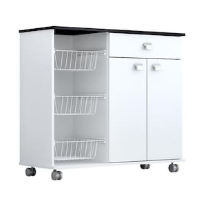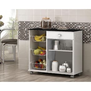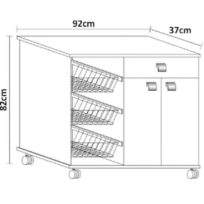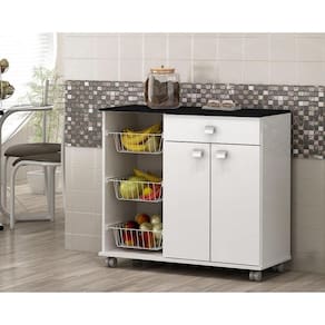 FRUTEIRA | A Fruteira Isis possui 1 gaveta grande com corrediças metálicas, 2 portas com prateleira interna e 3 cestos metálicos feitos com pintura eletrostática que não encardem e não enferrujam, fáceis de limpar. Ideal para armazenamento de frutas e legumes, possui rodízios para uma melhor movimentação e facilidade de limpeza. Pode ser utilizado para áreas de cozinha. Esse móvel é ideal para pessoas que gostam de organização. Produzido em MDP conta com um design sofisticado irá harmonizar com seu ambiente de casa. Além disso, o produto possui uma fácil montagem.