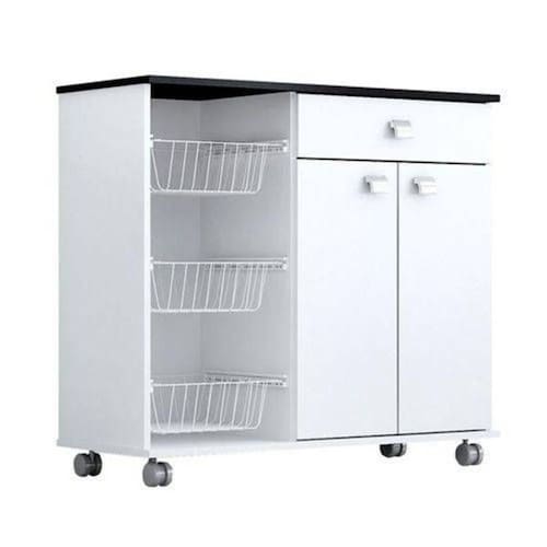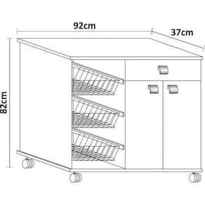 A Fruteira Isis possui 1 gaveta grande com corrediças metálicas, 2 portas com prateleira interna e 3 cestos metálicos feitos com pintura eletrostática, fáceis de limpar. Ideal para armazenamento de frutas e legumes, possui rodízios para uma melhor movimentação e facilidade de limpeza. Pode ser utilizado para áreas de cozinha. Produzido em MDP conta com um design sofisticado irá harmonizar com seu ambiente de casa. Além disso, o produto possui uma fácil montagem.Altura 0,82m x Larguras 0,92m x Profundidade 0,37m
