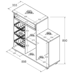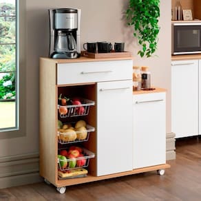 Sua cozinha vai ficar muito mais bonita e funcional com o Balcão Fruteira Multiuso Ditália. Alt-89,00 x Larg-89,,80 x Prof-33,00-Cm, Peso bruto 25,67 Kg - O tampos suportam até 15kg cada. O balcão possui duas portas e uma prateleira interna que suporta até 15 kg, possui uma gaveta com corrediça e três cestos/fruteiras metálicos em aramado, o produto possui também rodizíos que facilitam o deslocamento . Produto produzido em MDP 15mm e revestido em pintura UV atóxica, resitente moderno e funcional. Acabamento: Pintura UV Acabamento da Gaveta: Pintura UV Acabamento da Porta: Pintura UV Acabamento da Prateleira: Pintura UV Ambiente Principal: Cozinha Cesto para Frutas: 03 Cesto Removível: Sim Complexidade da Montagem: Baixa: pode ser montado por uma pessoa sozinha Cor: Carvalho / Branco Cor do Produto: Carvalho / Branco Escala de Brilho: Brilhante Escala de Brilho da Gaveta: Brilhante Escala de Brilho da Porta: Brilhante Escala de Brilho da Prateleira: Brilhante Gaveta com Chave: Não Informações Complementares: Antes de montar seu móvel, leia cuidadosamente o manual de instruções e o mantenha para futuras consultas. Itens Inclusos: Manual de montagem e Kit de Ferragens Manual de Montagem e Instalação: https://product-hub-prd.madeiramadeira.com.br/907893/documents/3828f23d-8d82-479f-9405-de50de49656f1948413130117156191326132.pdf Material da Dobradiça/Corrediça da Porta: Metálica Material da Gaveta: MDP Material da Porta: MDP Material da Prateleira: MDP Material do Cesto: Alumínio Material do Puxador da Gaveta: Plástico Material do Puxador da Porta: Plástico Material dos Pés: Plástico Necessita Montagem: Sim Origem do Produto: Nacional Peso: 23,97 kg Peso Máximo por Gaveta: 5 kg Peso Máximo por Prateleira: 15 kg Possui Pés: 04 Possui Portas: 02 Recomendações de Uso, Manutenção e Limpeza: Recomendamos a sempre utilizar o manual de montagem, pois nele constam as orientações corretas para montagem e uso do produto. Nele também consta o certificado de garantia de seu produto. Para limpeza de seu móvel, use uma flanela seca ou umedecida, e não utilize produtos químicos que possam danificar o produto. Rodízio com Trava: Não Sapatas Niveladoras: Não Sistema de Montagem: Parafusos e minifix. Suporta Até (kg): 65 kg Tipo de Corrediça da Gaveta: Simples Tipo de Dobradiça/Corrediça da Porta: Simples Tipo de Porta: Bater Tipo de Puxador da Gaveta: Externo Tipo de Puxador da Porta: Externo