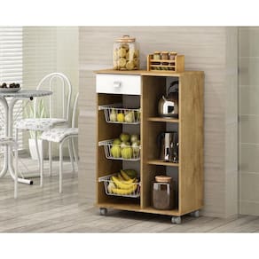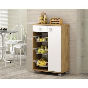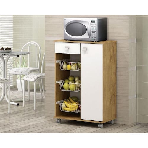 FRUTEIRA | A Fruteira Natasha possui 1 gaveta com corrediças metálicas, 1 portas com prateleira interna e 3 cestos metálicos feitos com pintura eletrostática que não encardem e não enferrujam, fáceis de limpar. Ideal para armazenamento de frutas e legumes, possui rodízios para uma melhor movimentação e facilidade de limpeza. Pode ser utilizado para áreas de cozinha. Esse móvel é ideal para pessoas que gostam de organização. Produzido em MDP conta com um design sofisticado irá amonizar com seu ambiente de casa. Além disso, o produto possui uma fácil montagem.