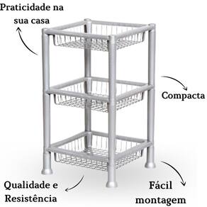 Cesto organizador fruteira com 3 andares empilháveis - cestos empilháveis até 3 andares e desmontáveis; - forma fácil e rápida de organizar suas coisas em qualquer cômodo da casa, principalmente na cozinha; - altura máxima de 56cm com os 3 andares; - material de qualidade, ao desmontar, vira uma peça compacta; -fácil higienização; -suporta até 3 kg por cesto; -produto resistente, fácil montagem e prático para o dia a dia. Especificações e ficha técnica - material: plástico - cor: cinza - quadrada -medidas: 56x31x31cm Itens inclusos - 01 cesto organizador empilhável 3 andares quadrado Informações importantes Produto com Marca: Não Informado