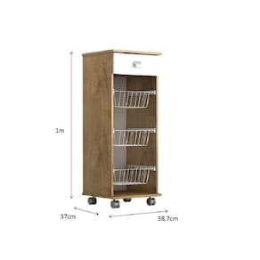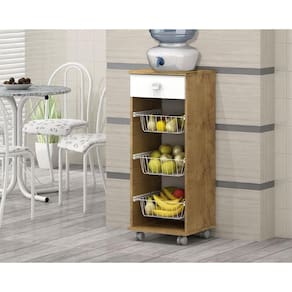 FRUTEIRA | A Fruteira Talita possui 1 gaveta com corrediças metálicas, 3 cestos metálicos feitos com pintura eletrostática que não encardem e não enferrujam, fáceis de limpar. Ideal para armazenamento de frutas e legumes, possui rodízios para uma melhor movimentação e facilidade de limpeza. Pode ser utilizado para áreas de cozinha e lavanderia. Esse móvel é ideal para pessoas que gostam de organização. Produzido em MDP conta com um design sofisticado irá harmonizar com seu ambiente de casa. Além disso, o produto possui uma fácil montagem.