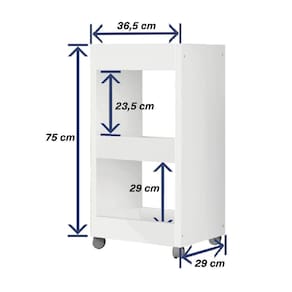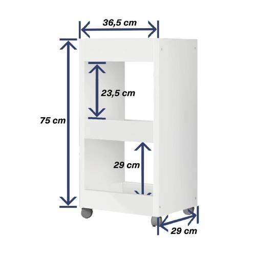 -75 cm de altura, -29 cm de profundidade, - 36,5 cm de largura, - altura útil entre as prateleiras 29cm - acabamento em alto brilho - chapas mdp 15mm de espessura, - com rodízios, - fácil montagem
