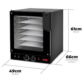 CARACTERISTICAS: - Consumo: 2,5 Kw/h - Potencia da resistencia: 2.500W - Potencia do motor: 1/30cv - Medidas externas: 49x66x61cm (CxLxA) - Temperatura maxima: 250ºC - Acompanha 6 esteiras de 35x35cm - Possui iluminacao interna de 35W - Possui timer de ate 120 minutos - Possui controle de temperatura (50-250ºC) - Possui paredes com isolamento termico