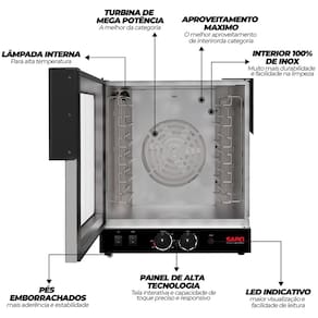 FORNO TURBO ELETRICO DE 6 ESTEIRAS: Este forno e a revolucao dos fornos industriais, sem fumaca, sem sujeira e com um sabor ainda melhor. Com acendimento automatico, neste forno voce apenas precisa apertar um botao e pronto, o aquecimento ja esta acesso. Achou pouco? este forno assa o seu alimento ainda mais rapido do que o normal, elimina a chance de queima-lo e permite ter o mesmo padrao sempre.