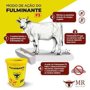 Com o consumo do sal tratado com Fulminante F3, o estrume dos animais sai medicado com o princípio ativo, impedindo o desenvolvimento das larvas das moscas e quebrando o ciclo reprodutivo. Isso é especialmente importante no Brasil, onde o clima propício favorece o surgimento de moscas e carrapatos durante todo o ano.