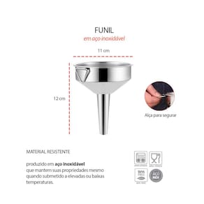 Funil em aço inox. Perfeito para drinks, doces, molhos e chas. Produzido todo em aço inoxidavel é duravel e pratico para limpar, indicado para uso na maquina de lavar louças. Funil perfeito para cozinha residencial ou industrial.