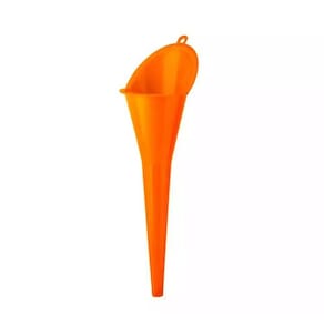 Informações do funil para automóvel: Altura: 27,9 cm. Largura: 8,1 cm. Diâmetro inferior: 1,3 cm. Cor: Laranja