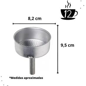 Funil para cafeteira italiana moka em alumínio - 12 xícaras Nosso empenho é procurar o que há de mais atual e funcional no mundo culinário e para organização da sua casa, priorizando sempre a qualidade e a versatilidade dos produtos. Funil para cafeteira italiana de 12 xícaras Você que ama sua cafeteira italiana, saiba que ela precisa de manutenção regular para funcionar corretamente e produzir o melhor café possível. O funil é o coração da cafeteira e o grande responsável pelo sucesso do modo de preparo, por isso deve ser substituído ao primeiro sinal de problema.Este funil é feito com materiais duráveis e de alta qualidade, para garantir que sua cafeteira italiana dure por muito mais tempo. Material:Alumínio Medidas:Aproximadamente 8 cm diâmetro Conteúdo da embalagem:1 funil para cafeteira italiana Gostou Esse produto pode ser seu aguardamos sua compra