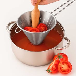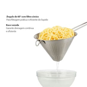 Passador Chinoy é a ferramenta essencial na cozinha profissional. Seu formato conico como funil, garante a coagem refinada de sopas, molhos e caldos, deixando-os com uma textura lisa. Produzido em aço inox de alta durabilidade, a malha fina garante uma filtragem detalhada, deixando seus pratos com acabamento profissional. Seu material de qualidade superior proporciona segurança alimentar, enquanto o formato ergonomico facilita o manuseio, tornando o processo de coar pratico e eficiente.