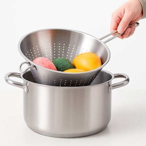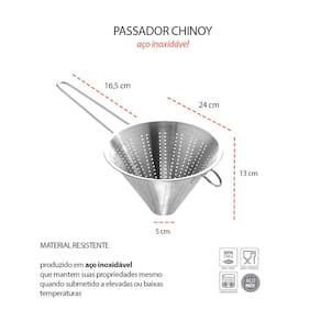 Passador Chinoy é a ferramenta essencial na cozinha profissional. Seu formato conico como funil, garante a coagem refinada de sopas, molhos e caldos, deixando-os com uma textura lisa. Produzido em aço inox de alta durabilidade, a malha fina garante uma filtragem detalhada, deixando seus pratos com acabamento profissional. Seu material de qualidade superior proporciona segurança alimentar, enquanto o formato ergonomico facilita o manuseio, tornando o processo de coar pratico e eficiente.