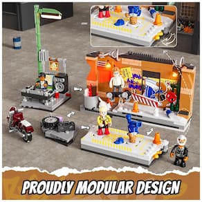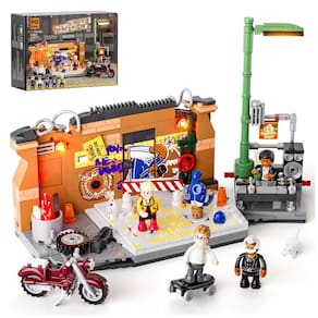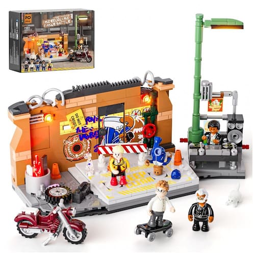 O sistema de iluminação inclui quatro pontos de LED distribuídos em elementos como tambor com fogo, postes de luz e sinalizador de alerta, criando atmosfera de apresentação noturna. O produto é indicado para adolescentes e adultos, com montagem voltada para exposição em coleções de cidade e cultura de rua.