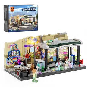 Conjunto de blocos de montar em plástico que representa um ponto de ônibus urbano inspirado em cenário de rua dos anos 1990, com abrigo, muro lateral, calçada e pequeno espaço de feira. A ambientação destaca elementos de cultura de rua, com grafites, lixeira tematizada, tampa de bueiro e jornais espalhados para compor uma cena urbana detalhada.?