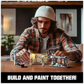 As peças impressas incluem murais de grafite em grande formato e ilustrações de animais estilizados, criando um painel visual de destaque no fundo do cenário. O conjunto traz minifiguras com visual de rua, como artista de grafite, usuária de skate, trabalhadora e passageira, permitindo montar diferentes interações no ponto de ônibus.?