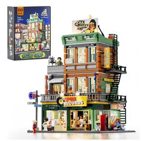 Conjunto de blocos de montar em plástico que representa uma loja de discos em ambiente urbano, com três níveis funcionais: área de venda de discos no térreo, estúdio de gravação no segundo piso e lounge para encontros e atividades musicais no terceiro andar. A fachada utiliza elementos de cultura de rua, com letreiros, vitrines e painéis decorativos associados a música e hip-hop.??