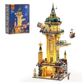 Conjunto de blocos de montar em plástico que representa uma torre de observatório em estilo steampunk, com arquitetura inspirada no período vitoriano e elementos industriais como engrenagens, tubulações e revestimentos em tons metálicos. A estrutura vertical combina base técnica, corpo principal com janelas coloridas e cúpula superior com telescópio ajustável, concebida para exposição em coleções temáticas.