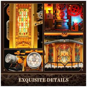 Os detalhes externos e internos utilizam grande quantidade de peças com rolagem de impressão e elementos em vidro colorido, criando superfícies ricas em textura, painéis decorativos e vitrais. A paleta combina verdes profundos, cobre envelhecido e metais escurecidos, aproximando o modelo de um equipamento científico de época reinterpretado em linguagem steampunk.