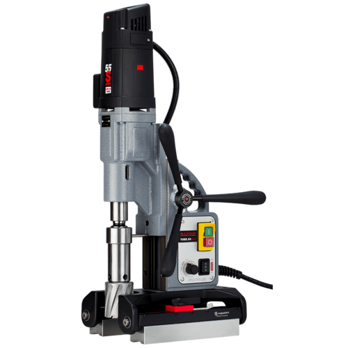 A furadeira portátil de base magnética Euroboor TUBE.55S/T é especialmente projetada para ser usada em tubos. Devido ao magnetismo incrivelmente forte do ímã, a Tube.55S/T é adequada tanto para perfurar quanto para rosquear mesmo em aço com espessura de apenas 3mm (1/8"). A Tube.55S/T faz furos de até ø 55mm (2 3/16") e pode ser utilizada com facilidade em materiais tubulares com diâmetro de 80mm (3,15") ou maior. A TUBE.55S/T também se beneficia da tecnologia Smart Restart (reinicialização inteligente) e um display digital que mostra a carga de trabalho ideal. Quando o sensor GYRO-TEC detecta qualquer vibração excessiva ou deslocamento repentino, ele desliga automaticamente a máquina.