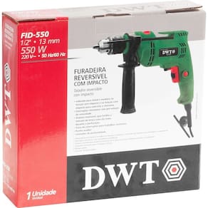 Produto: Furadeira | Voltagem: 220 | Marca: DWT | Modelo: Fid 550 | MPN: Fid 550 | Tamanho do mandril: 1/3 | Inclui bateria: Não | Quantidade de baterias: 0 | Modelo detalhado: Fid 550 | É sem fio: Não | Inclui carregador: Não
