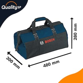 Acompanha a Bolsa Média Bosch, feita em nylon super resistente, com capacidade para até 15 kg e base emborrachada, ideal para transportar suas ferramentas com segurança e organização. Possui compartimentos externos e espaço para até duas ferramentas grandes.
