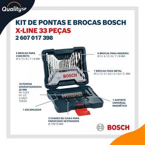 Para completar, o Jogo de Brocas X-Line com 33 peças oferece tudo o que você precisa para perfurações em madeira, metal e alvenaria. As brocas vêm organizadas em uma maleta resistente e prática, com suporte magnético e acessórios versáteis para diversas aplicações.