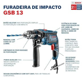 Furadeira de impacto 650w gsb 13 re bosch gsb13re