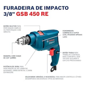 Caracteristicas Importantes do Produto Marca: Bosch Modelo: Furadeira de Impacto GSB 450 RE 450W Segmento: Furadeira de Impacto Cor:Azul