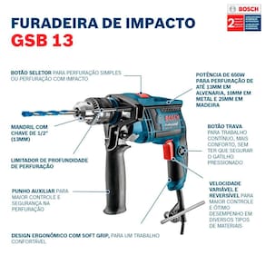 Com design moderno e motor de 650W, o modelo GSB 13 RE é potente e dinâmico para todas as tarefas. Projetado com um interruptor eletrônico e velocidade variável, permite que sejam realizados, em uma única ferramenta, inúmeros trabalhos como parafusar, desparafusar, furar materiais frágeis e também os mais robustos.