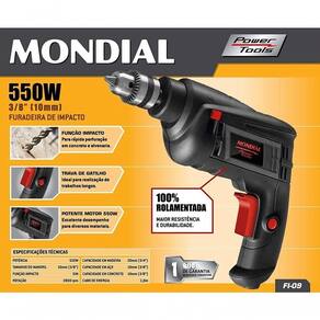 Furadeira De Impacto Mondial 3/8 Pol. All Black 550w 220v Muito mais resistência e durabilidade. A Furadeira de Impacto 550W da Mondial é totalmente rolamentada, o que aumenta a vida útil do seu equipamento. Sua função impacto vai ajudar na perfuração de diversos materiais, inclusive concreto e alvenaria. Combinada com a velocidade de 2800 RPM você ainda conta com muito mais rapidez e praticidade na hora de colocar a mão na massa. A trava do gatilho é nossa forma de cuidar da sua segurança. Ela é ideal para trabalhos que demandam mais tempo, trocas de posições e brocas. A Mondial é a marca de eletrodomésticos mais vendida do Brasil e a escolha de milhões de consumidores. Sempre inovando e buscando soluções para o bem-estar das pessoas, oferece uma linha completa de produtos. A Furadeira de Impacto com trava para perfuração contínua, foi projetada para perfurar madeira, metal, plástico e alvenaria. Possui alta durabilidade desempenho.Características:Mandril 3/8Botão seletor de modo de perfuração impactoTrava para perfuração contínuaChave do mandrilEspecificações Técnicas:Potência: 550 WConsumo: 0,55Kw/hMaterial: Metal e PPMandril: 10mm (3/8?)Velocidade: 2.800RPMFunção Impacto100% rolamentadaCapacidade em:Madeira: 20mm (13/4?)Aço: 10mm (3/8?)Concreto: 10mm (3/8?)Cabo de energia: 1,0mVoltagem: 110V OU 220V (NÃO É BIVOLT) Ean: 7908259500537
