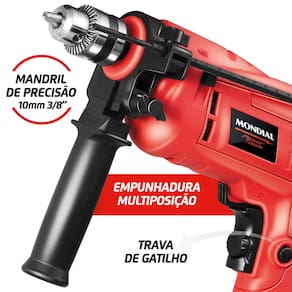 Com função impacto, a Furadeira NFFI-07 vermelha tem velocidade variável e reversível, de 2.200 à 2.800 RPM, além de 650w de potência, empunhadura multiposição e mandril de 3/8 (10 mm), com maior capacidade de perfuração. Com a função impacto, você perfura mais rápido mesmo paredes de concreto e de alvenaria. Ela tem velocidade reversível de 2.200 RPM à 2.800 RPM. Seu motor é potente, com 650W, tendo excelente desempenho em vários materiais. Já a sua empunhadura multiposição oferece ótimo desempenho, além de mais comodidade e segurança para você fazer vários trabalhos. A Furadeira NFFI07 tem mandril no padrão de 10 mm (3/8). Além disso, ela tem capacidade de perfuração de 20 mm (3/4) em madeira, 10 mm (3/8) em aço e 10 mm (3/8) em concreto. Tudo isso com a qualidade Mondial, com 1 ano de garantia de fábrica. Ean: 7898490166749