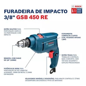 Furadeira de Impacto 3/8" 450W GSB 450 RE 220V BoschA Furadeira de Impacto Bosch GSB 450 RE, com potência de 450 W, é a melhor escolha para quem busca a confiança da marca Bosch por um preço arrasador. Mais confortável, com apenas 1,6 Kg, perfura alvenaria, madeira e metal, com e sem impacto, graças ao botão comutador.Realize, também, parafusamentos através da função de reversão e faça trabalhos contínuos com o auxílio do botão trava. Tudo isso com 1 ano de garantia e suporte da Assistência Técnica Bosch, que oferece o serviço mais rápido e barato que a concorrência.Características da Furadeira de Impacto 3/8" 450W GSB 450 RE 127V (110V) BoschA furadeira GSB 450 RE da Bosch apresenta um motor capaz de alcançar 3000 RPM (Rotações Por Minuto) e 49600 IPM (Impactos Por Minuto). ALém de possuir um mandril de 3/8 " (polegada) ou 10 mm, ela garante perfurações em diversos materiais como concreto (até 10 mm), madeira (20 mm) e aço (10 mm).Vantagens da Furadeira de Impacto 3/8" 450W GSB 450 RE 220V BoschAcessível e confiável:• Qualidade Bosch a preço baixo, primeira e melhor opção para usuários orientados para o preço.Precisa e rápida na aplicação:• Diâmetro e posicionamento adequados;• Fácil identificação do comando de perfuração;• Maior quantidades de impactos por minuto.Leve, compacta e versátil• Máquina leve permite menos desgaste físico;• Compacta, fácil de manusear;• Design ergonômico;• Permite perfurar e parafusar/desparafusar com facilidade.