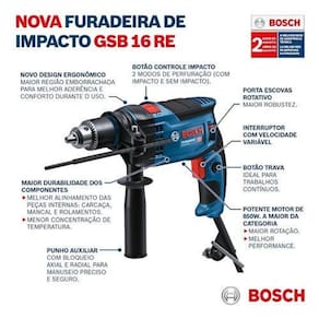 A nova furadeira de impacto bosch gsb 16 re agora com 850w de potência para os trabalhos mais exigentes. Sua carcaça robusta tipo pote garante maior durabilidade e vida útil da ferramenta. Recomendada para uso industrial. Trabalho continuo. Robusta carcaça de engrenagem tipo pote: maior vida útil e durabilidade do produto. Punho auxiliar com bloqueio axial e radial: manuseio preciso e seguro. Informações técnicas: modelo: gsb 16 re potência: 850 w nº de rotações em vazio, 1 velocidade: 0 - 3. 250 r. P. M. Nº máx. De impactos em vazio: 0 - 48. 500 i. P. M. Torque nominal: 2,1 nm amplitude de aperto, min. /máx. : 1,5 - 13 mm diâmetro de perfuração em concreto: 16 mm diâmetro de perfuração em madeira: 25 mm diâmetro de perfuração em aço: 12 mm garantia de 2 anos do fabricante. Itens inclusos: - 1 maleta; - 1 empunhadeira lateral; - 1 medidor de profundidade. A tecnologia da bosch molda muitas áreas da sua vida. A garantia de sucesso da empresa baseia-se na sustentabilidade, o que garante o crescimento a longo prazo e, ao mesmo tempo, a proteção ambiental. As furadeiras da bosch são multi-talentosas para as aplicações mais versáteis e foram projetadas para atender às mais altas demandas em termos de potência e vida útil. Desfrute do máximo controle e precisão em uma ampla variedade de materiais. Esta ferramenta é muito resistente e é capaz de lidar com as aplicações mais complexas no local de trabalho. A bosch professional caracteriza-se por um design compacto que proporciona um manuseio ideal e a torna na ferramenta perfeita para trabalhar em altura e em espaços apertados. Tecnologia de excelência seu mandril de 13 mm permitirá que você manipule facilmente a ferramenta com segurança e precisão. Além disso, sua velocidade variável oferece uma grande experiência de uso, adaptada às suas necessidades e seus requerimentos. Versatilidade e eficiência use-o para as aplicações que você desejar. Sendo um martelo e parafusadeira, você poderá explorar ao máximo as suas funções e obter precisão e qualidade. Cód. Bosch: 06012b90e1