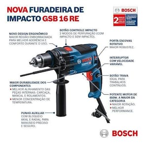 A nova Furadeira de Impacto Bosch GSB 16 RE agora com 850W de potência para os trabalhos mais exigentes. Sua carcaça robusta tipo pote garante maior durabilidade e vida útil da ferramenta. Recomendada para uso industrial. Trabalho continuo. Robusta carcaça de engrenagem tipo pote: maior vida útil e durabilidade do produto. Punho auxiliar com bloqueio axial e radial: manuseio preciso e seguro. Informações Técnicas: Modelo: GSB 16 RE Potência: 850 W Nº de rotações em vazio, 1 velocidade: 0 - 3.250 r.P.M. Nº máx. De impactos em vazio: 0 - 48.500 i.P.M. Torque nominal: 2,1 Nm Amplitude de aperto, min./máx.: 1,5 - 13 mm Diâmetro de perfuração em concreto: 16 mm Diâmetro de perfuração em madeira: 25 mm Diâmetro de perfuração em aço: 12 mm de 2 anos do fabricante. Itens Inclusos: - 1 Maleta; - 1 Empunhadeira lateral; - 1 Medidor de profundidade. A tecnologia da Bosch molda muitas áreas da sua vida. A de sucesso da empresa baseia-se na sustentabilidade, o que garante o crescimento a longo prazo e, ao mesmo tempo, a proteção ambiental. As furadeiras da Bosch são multi-talentosas para as aplicações mais versáteis e foram projetadas para atender às mais altas demandas em termos de potência e vida útil. Desfrute do máximo controle e precisão em uma ampla variedade de materiais. Esta ferramenta é muito resistente e é capaz de lidar com as aplicações mais complexas no local de trabalho. A Bosch Professional caracteriza-se por um design compacto que proporciona um manuseio ideal e a torna na ferramenta perfeita para trabalhar em altura e em espaços apertados. Tecnologia de excelência Seu mandril de 13 mm permitirá que você manipule facilmente a ferramenta com segurança e precisão. Além disso, sua velocidade variável oferece uma grande experiência de uso, adaptada às suas necessidades e seus requerimentos. Versatilidade e eficiência Use-o para as aplicações que você desejar. Sendo um martelo e parafusadeira, você poderá explorar ao máximo as suas funções e obter precisão e qualidade. Cód. Bosch: 06012B90E1 Ficou alguma dúvida Faça sua pergunta, ficaremos satisfeitos em lhe atender bem. Emitimos . Qualidade, preço Justo e atendimento Perfeito. Marca: Não Informado